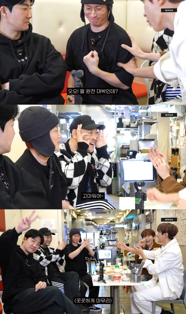 ÇÏ·ç°¡ ž±â ÀüºÎÅÍ ÀÚÁÖ ¿Ô´Ù´Â ´Ü°ñ ºÐ½ÄÁý¿¡¼ ¸Þ´º¸¦ ¸ðµÎ ½Ãų ±â¼¼·Î ÁÖ¹®À» ¸¶Ä£ ¿¡ÇÈÇÏÀÌ¿Í µµ°â, ½Â°üÀº ¿îµ¿À» ÅëÇÑ ±ÙÀ° ºÎ½ÉÀ» ºÎ·È´Ù. µµ°â°ú ½Â°üÀº Ÿºí·ÎÀÇ °¡½¿ ±ÙÀ°À» ¸¸Á®º¸¸ç ¡°»ý°¢º¸´Ù ¾öû ´Ü´ÜÇÏ´Ù¡±¶ó°í ¸»Çß°í, À̵éÀº ¼·Î¸¦ ĸƾ ¾Æ¸Þ¸®Ä«¿Í Å丣·Î ºñ±³Çß´Ù. ÀÌ °¡¿îµ¥ µµ°âÀÌ 30´ë¿¡ Á¢¾îµé¾ú´Ù´Â Á¡¿¡ ±â¸³¹Ú¼ö¸¦ º¸³»¸ç ¡°À£ÄÄ Åõ ¾ÆÀú¾¾ ºê·Î¡±¶ó°í ÃàÇÏÇß´Ù.