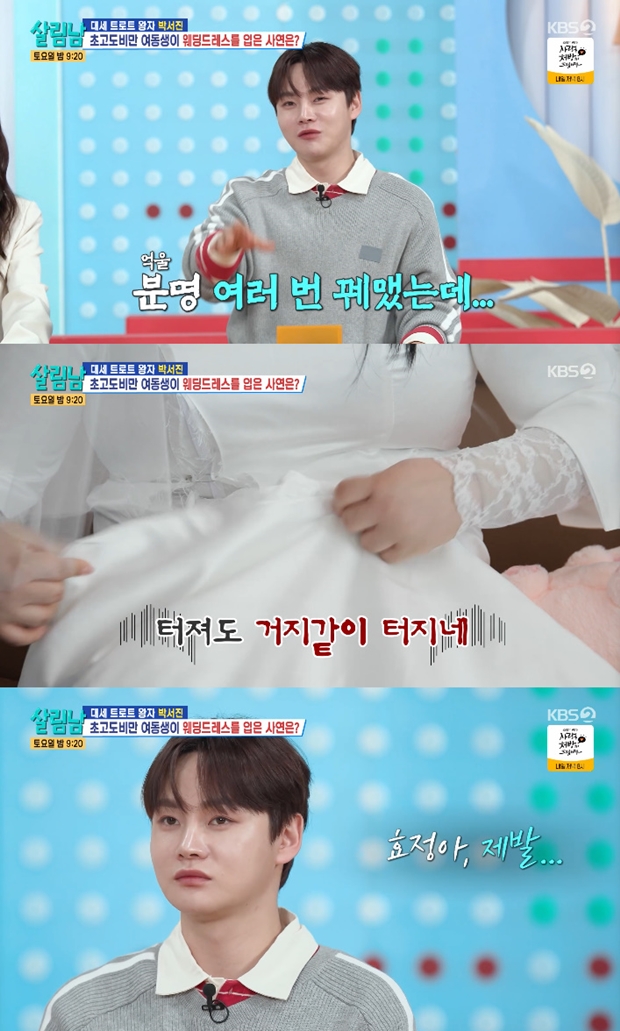 À̳¯ ¹Ú¼­ÁøÀº µ¿»ýÀ» À§ÇÑ ¿þµùµå·¹½º¸¦ Á¦ÀÛÇß´Ù. ÀÌ ¸ð½ÀÀ» º» µ¿»ý ¹ÚÈ¿Á¤ ¾¾´Â ¿Àºü °áÈ¥ÇϳÄ"¶ó°í ¹°¾ú°í ¹Ú¼­ÁøÀº "°áÈ¥ÇÏ´Â µ¥ ³»°¡ µå·¹½º¸¦ ¿Ö ÀÔ°Ú³Ä"¶ó¸ç "³× °Å´Ù. ³ÊÀÇ ´ÙÀÌ¾îÆ® ¼º°øÀ» À§ÇØ ¸¸µå´Â °Å´Ù"¶ó°í ¸»Çß´Ù.